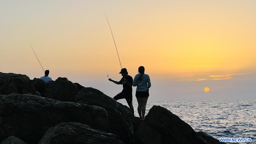 TEL AVIV, 16 octubre, 2022 (Xinhua) -- Imagen del 15 de octubre de 2022 de personas pescando al atardecer junto al mar Mediterráneo, en la ciudad de Tel Aviv, en el centro de Israel. (Xinhua/Muammar Awad)