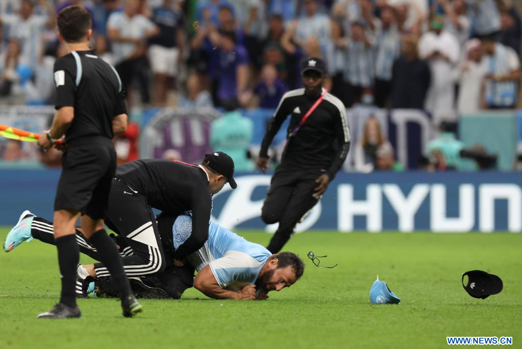 LUSAIL, 9 diciembre, 2022 (Xinhua) -- Un invasor de cancha (2-d), es tacleado por empleados durante el partido correspondiente a los cuartos de final entre Países Bajos y Argentina en la Copa Mundial de la FIFA 2022, en el Estadio Lusail, en Lusail, Qatar, el 9 de diciembre de 2022. (Xinhua/Cao Can)