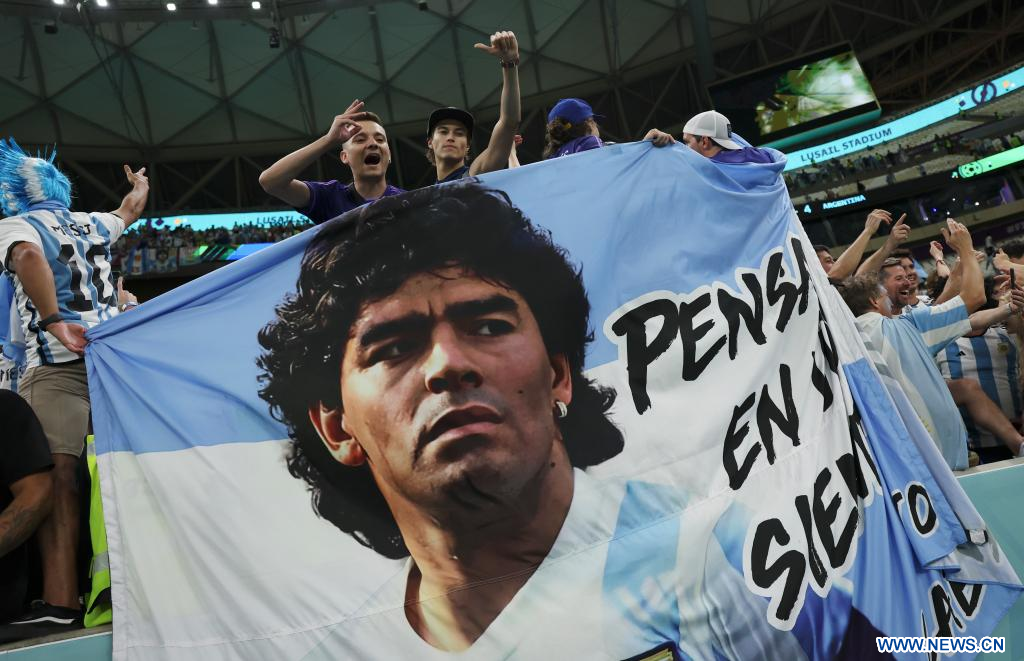 LUSAIL, 9 diciembre, 2022 (Xinhua) -- Aficionados de Argentina muestran una bandera con el retrato de Diego Maradona al término del partido correspondiente a los cuartos de final entre Países Bajos y Argentina en la Copa Mundial de la FIFA 2022, en el Estadio Lusail, en Lusail, Qatar, el 9 de diciembre de 2022. (Xinhua/Zheng Huansong)