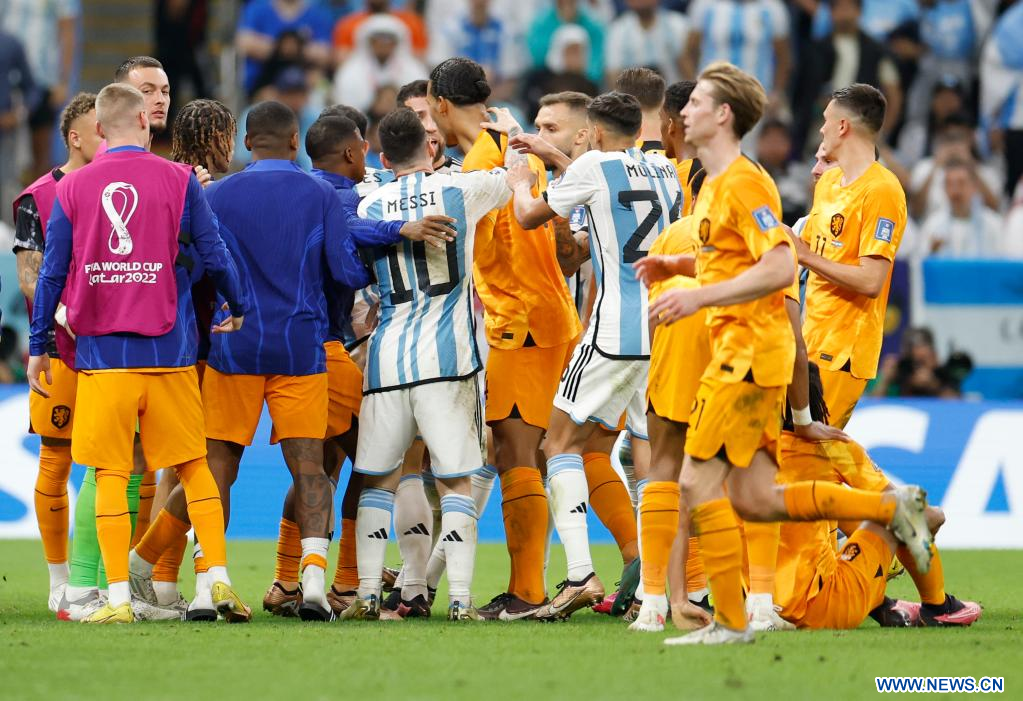 LUSAIL, 9 diciembre, 2022 (Xinhua) -- Jugadores discuten entre ellos durante el partido correspondiente a los cuartos de final entre Países Bajos y Argentina en la Copa Mundial de la FIFA 2022, en el Estadio Lusail, en Lusail, Qatar, el 9 de diciembre de 2022. (Xinhua/Wang Lili)