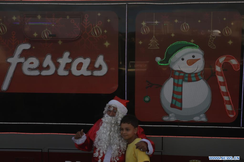 SAO PAULO, 18 diciembre, 2022 (Xinhua) -- Imagen del 17 de diciembre de 2022 de personas tomándose fotografías frente a autobuses públicos decorados con motivos navideños, en Sao Paulo, Brasil. (Xinhua/Rahel Patrasso)