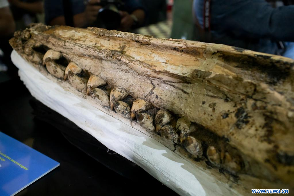 Imagen del 15 de febrero de 2023 del cráneo con mandíbulas de una nueva especie de cachalote macroraptor durante su presentación en el Museo de Historia Natural de la Universidad Nacional Mayor de San Marcos (UNMSM), en Lima, Perú. Un grupo de paleontólogos de Perú ha reportado el hallazgo del cráneo con mandíbulas de una nueva especie de cachalote macroraptor, que se preservó intacto por siete millones de años, informó el miércoles la UNMSM. (Xinhua/Mariana Bazo)