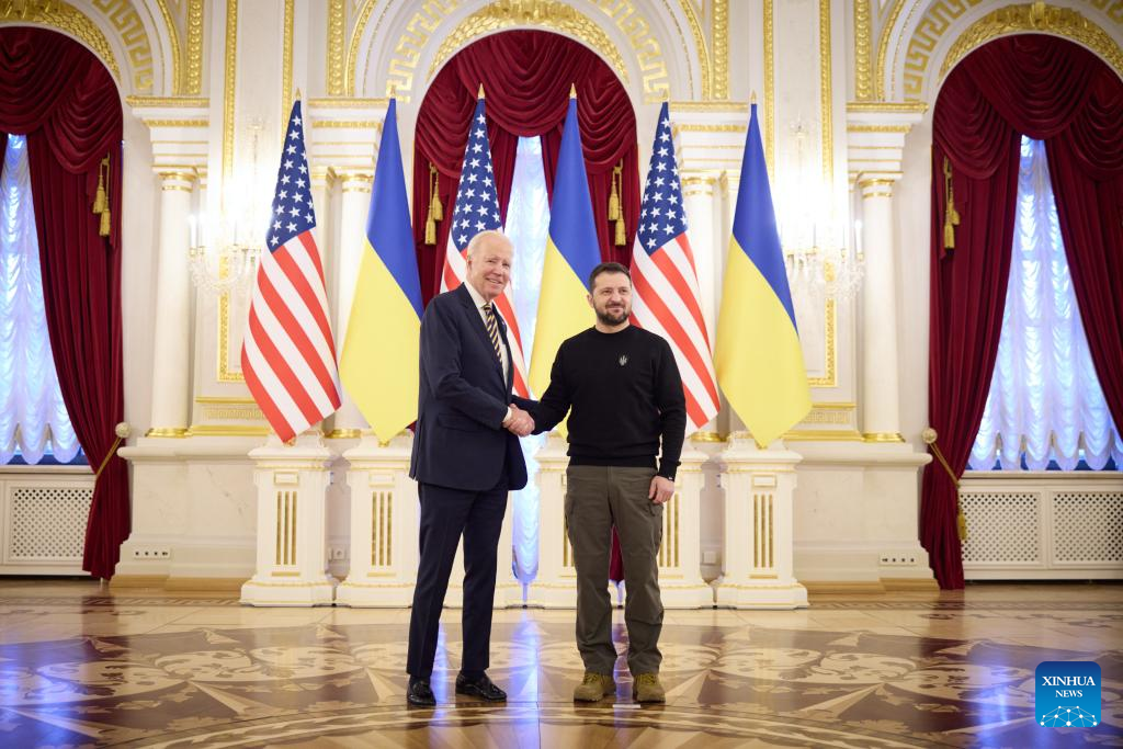 El presidente ucraniano, Volodymyr Zelensky (d), se reúne con el presidente estadounidense, Joe Biden, en Kiev, Ucrania, el 20 de febrero de 2023. El presidente de Estados Unidos, Joe Biden, hizo el lunes una visita no anunciada a Kiev, capital de Ucrania, un día después de que miles de personas se manifestaran en Washington para protestar contra la política exterior belicosa de Estados Unidos y su papel en varios conflictos en todo el mundo. Biden sostuvo conversaciones con su homólogo ucraniano, Volodymyr Zelensky, sobre la situación en la línea del frente en Ucrania y anunció 500 millones de dólares adicionales en ayuda militar para Ucrania, además de los más de 50.000 millones de dólares ya prometidos, una acción que se cree ampliamente agravará aún más la crisis ucraniana. (Xinhua/Oficina Presidencial Ucraniana)