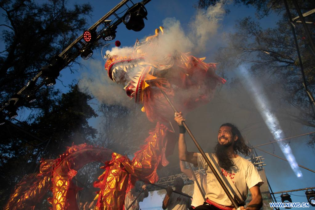 Imagen del 11 de marzo de 2023 de un artista marcial de la escuela Mei Hua realizando la danza del Dragón durante un festival de la cultura china en el Paseo del Bosque, en la ciudad de La Plata, Argentina. Las tradiciones milenarias de China en ámbitos como la danza, la música, la indumentaria y la gastronomía se convirtieron el sábado en el eje de un atractivo festival realizado en la ciudad de La Plata, evento que permitió ratificar que la cultura china se ha integrado en la vida de los argentinos. (Xinhua/Martín Zabala)
