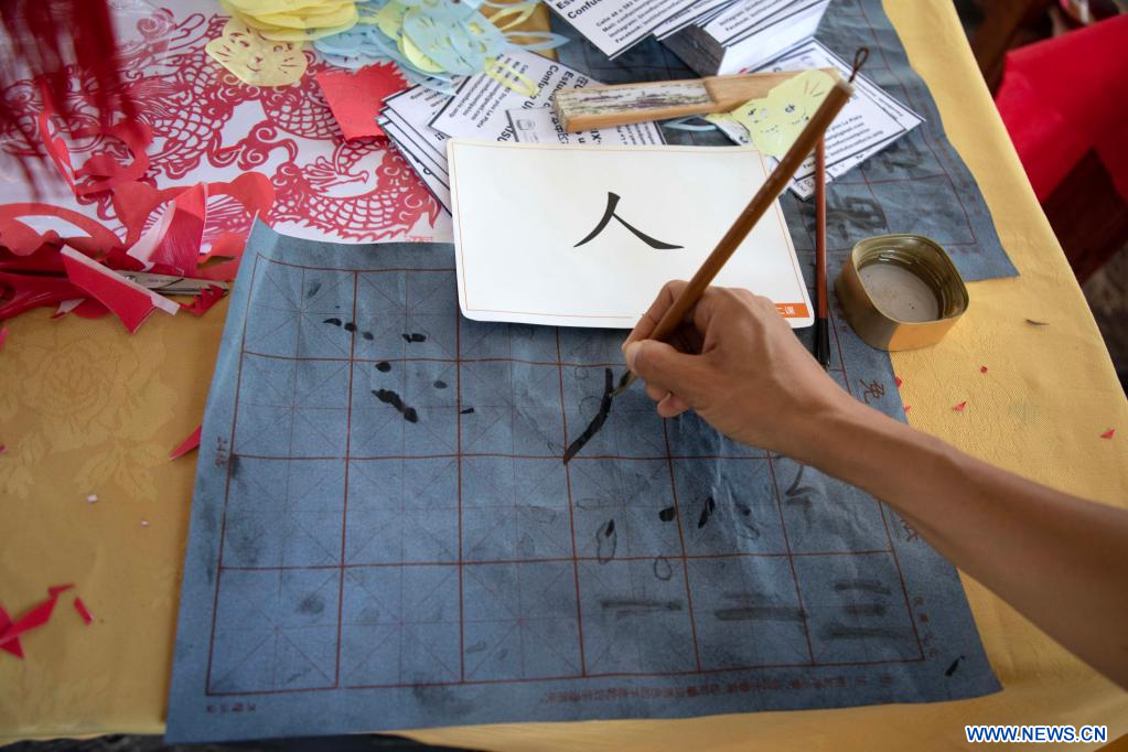 Imagen del 11 de marzo de 2023 de una persona practicando caligrafía china en un estand durante un festival de la cultura china en el Paseo del Bosque, en la ciudad de La Plata, Argentina. Las tradiciones milenarias de China en ámbitos como la danza, la música, la indumentaria y la gastronomía se convirtieron el sábado en el eje de un atractivo festival realizado en la ciudad de La Plata, evento que permitió ratificar que la cultura china se ha integrado en la vida de los argentinos. (Xinhua/Martín Zabala)