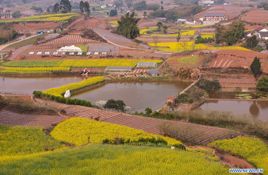 RONGXIAN, 12 marzo, 2023 (Xinhua) -- Vista aérea del 11 de marzo de 2023 de un paisaje de las tierras de cultivo, en la aldea de Tiangongmiao, en el poblado de Lede, en el distrito de Rongxian de la provincia de Sichuan, en el suroeste de China. (Xinhua/Jiang Hongjing)