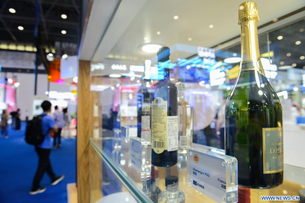 HAIKOU, 13 abril, 2023 (Xinhua) -- Imagen del 13 de abril de 2023 de productos de champaña francesa exhibidos en el pabellón nacional francés en la III Exposición Internacional de Productos de Consumo de China (CICPE, siglas en inglés), en Haikou, provincia de Hainan, en el sur de China. La III CICPE en curso celebrada en la provincia meridional china de Hainan ha visto una participación activa de empresas francesas con experiencia en importantes sectores de consumo que incluyen fragancias y sabores, cosméticos, alimentos y joyería. (Xinhua/Wang Zecong)