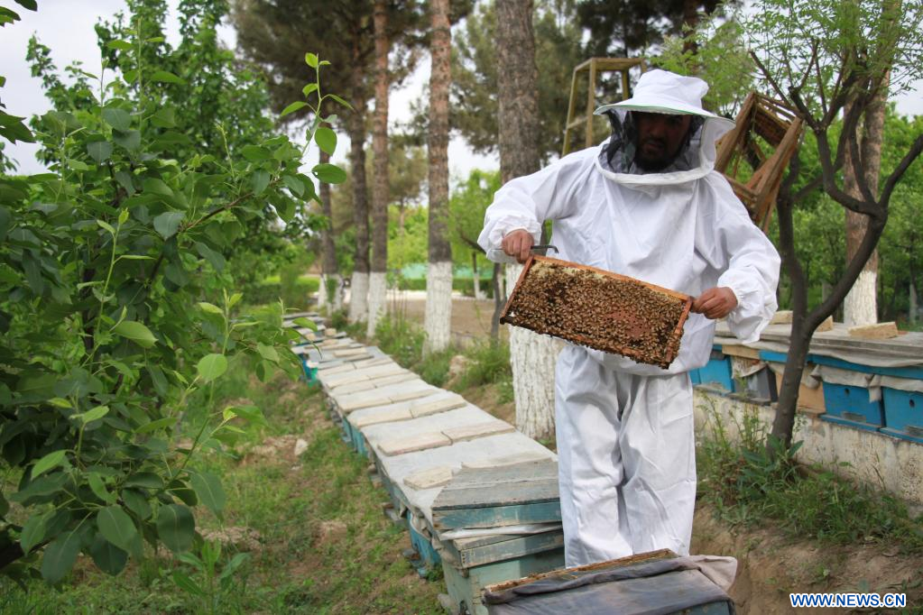 BALKH, 5 abril, 2023 (Xinhua) -- Imagen del 3 de abril de 2023 de un apicultor mostrando una sección de una colmena en una granja apícola, en la provincia de Balkh, Afganistán. (Xinhua/Khibar Momand)