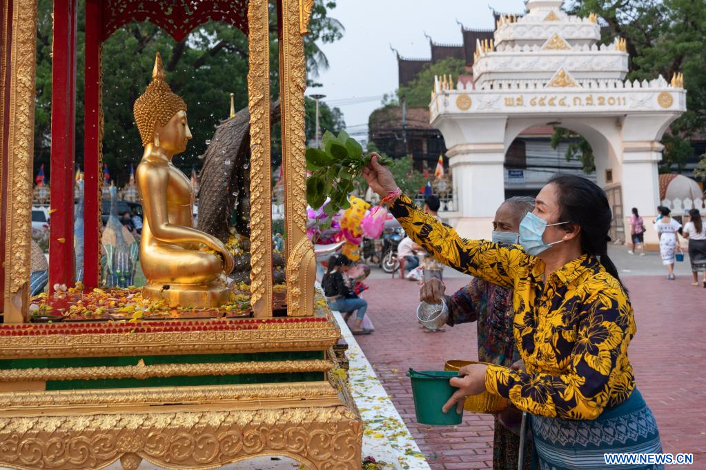 VIENTIAN, 15 abril, 2023 (Xinhua) -- Imagen del 14 de abril de 2023 de personas locales rociando agua sobre una estatua de Buda con motivo del festival Songkran, en Vientián, Laos. El Songkran es un festival tradicional laosiano de Año Nuevo que se celebra de múltiples maneras. (Xinhua/Kaikeo Saiyasane)