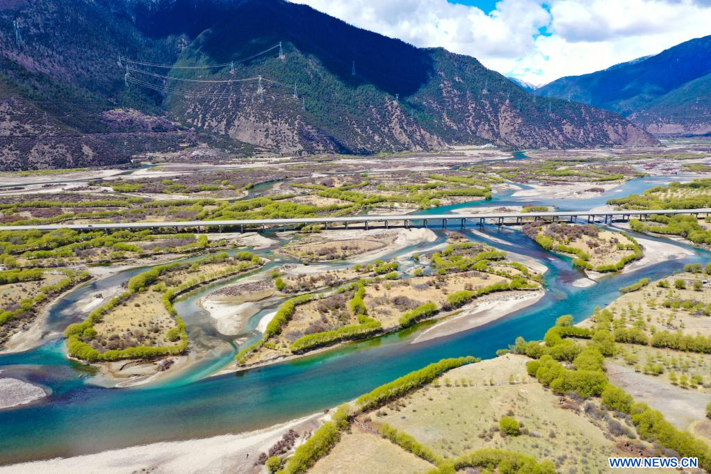 LHASA, 9 abril, 2023 (Xinhua) -- Vista aérea del 7 de abril de 2023 del paisaje primaveral en el parque nacional de humedales de Yani, en Nyingchi, en la región autónoma del Tíbet, en el suroeste de China. (Xinhua/Tian Jinwen)