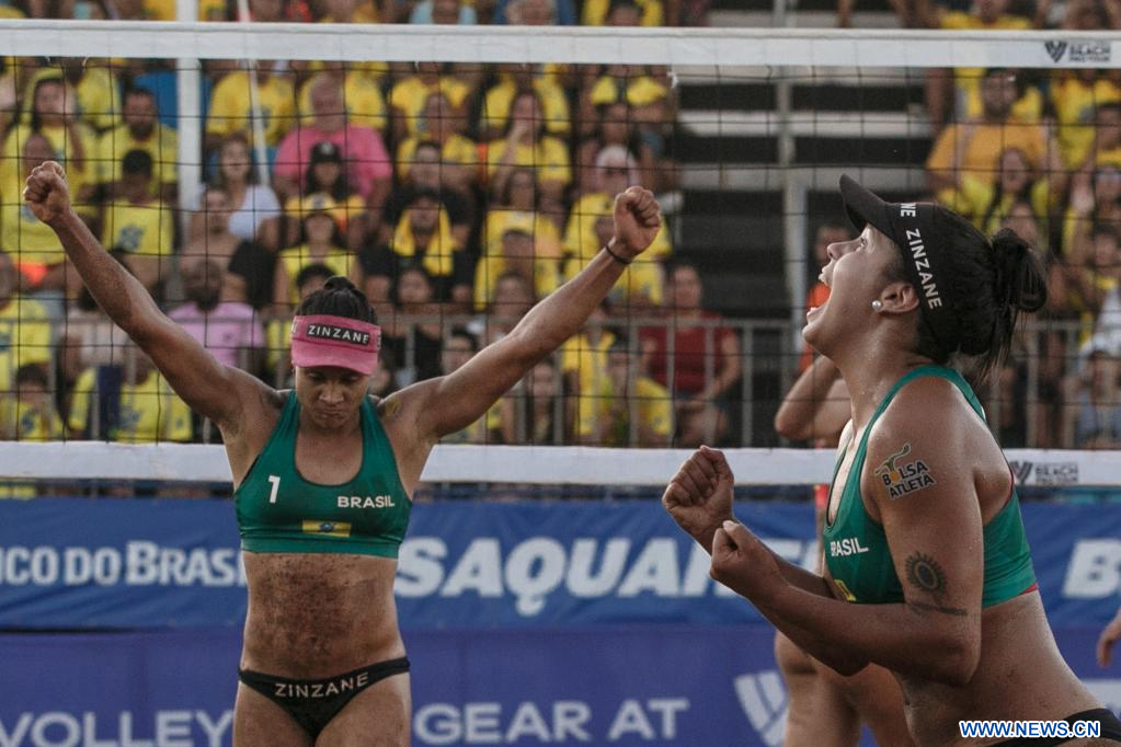 SAQUAREMA, 17 abril, 2023 (Xinhua) -- Imagen del 16 de abril de 2023 de Tainá (i), y Victória (d), de Brasil, festejando al término del partido correspondiente a la final del Volleyball World Beach Pro Tour Challenge, ante Gottardi y Menegatti, de Italia, en Saquarema, Río de Janeiro, Brasil. (Xinhua/Claudia Martini)