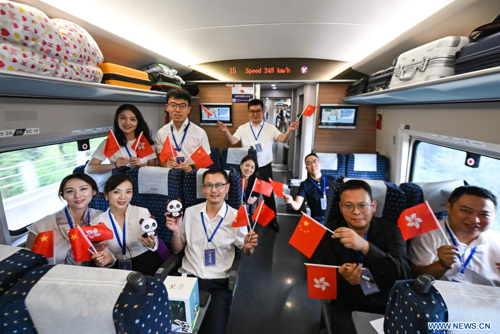 CHENGDU, 1 julio, 2023 (Xinhua) -- Pasajeros observan una presentación en el tren de alta velocidad G2963, el 1 de julio de 2023. El tren comenzó el sábado por la mañana proveniente de Chengdu, capital de la provincia de Sichuan en el suroeste de China, con dirección a Hong Kong. Marcó la apertura de un servicio de tren de alta velocidad entre Chengdu y Hong Kong. (Xinhua/Xing Tuo)