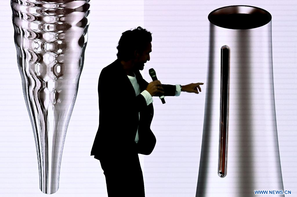 PARIS, 25 julio, 2023 (Xinhua) -- El diseñador de la antorcha, Mathieu Lehanneur, pronuncia un discurso en una conferencia de prensa para presentar el diseño de la antorcha olímpica y paralímpica de París 2024, en París, Francia, el 25 de julio de 2023. (Xinhua/Julien Mattia)
