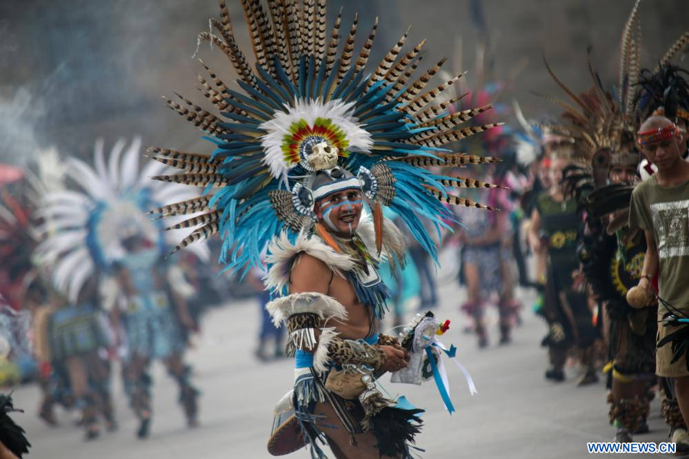 CIUDAD DE MEXICO, 26 julio, 2023 (Xinhua) -- Danzantes participan en la celebración del 698 aniversario de la fundación de México-Tenochtitlan, en el Zócalo de la Ciudad de México, capital de México, el 26 de julio de 2023. (Xinhua/Francisco Cañedo)