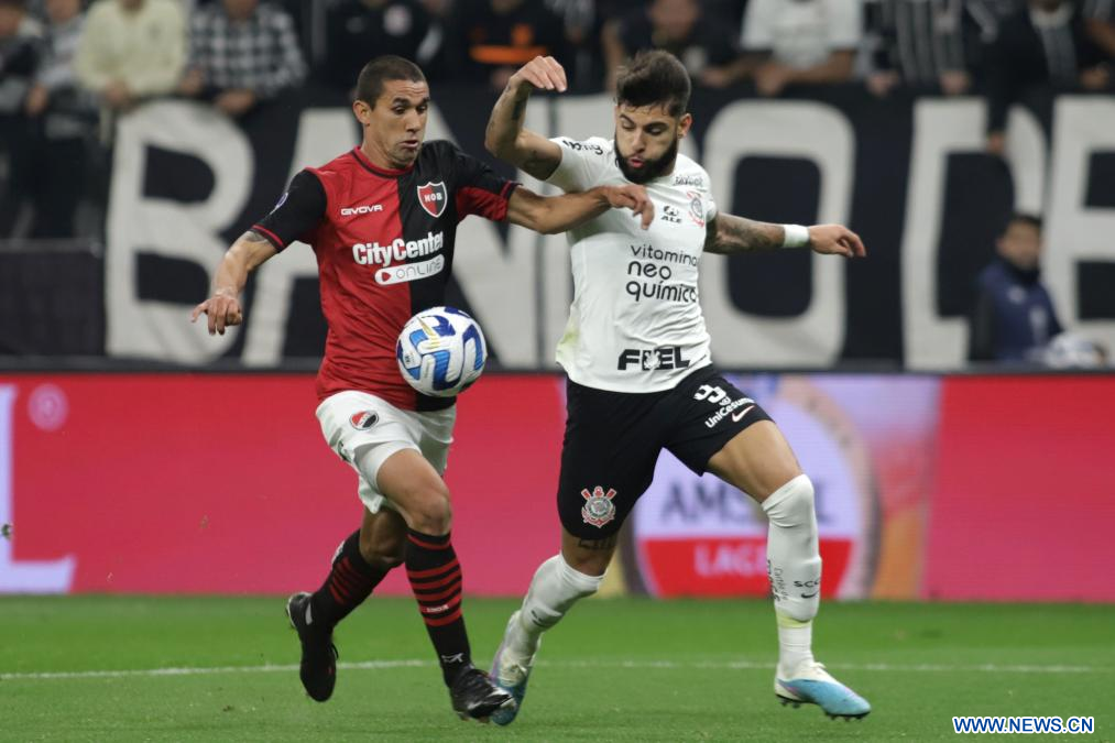SAO PAULO, 2 agosto, 2023 (Xinhua) -- Imagen del 1 de agosto de 2023 del jugador Matheus Bidu (d), de Corinthians de Brasil, disputando el balón con Jorge Racalde (i), de Newell's Old Boys de Argentina, durante el partido de ida de los octavos de final de la Copa Conmebol Sudamericana 2023, celebrado en el Estadio Neo Química Arena, en Sao Paulo, Brasil. (Xinhua/Rahel Patrasso)