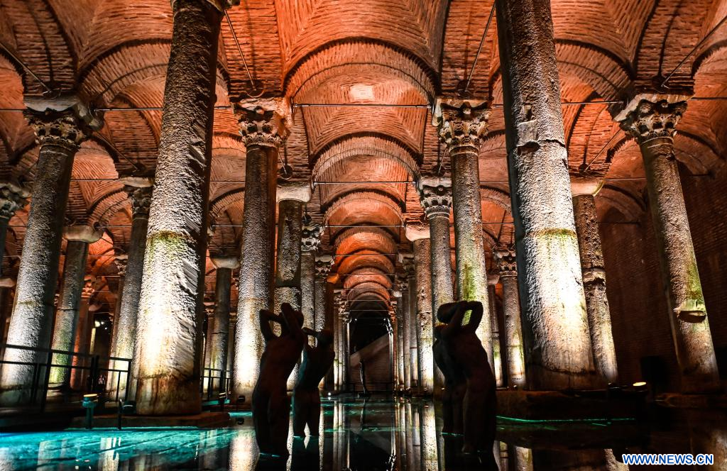 ESTAMBUL, 1 septiembre, 2023 (Xinhua) -- Imagen del 29 de agosto de 2023 de la Cisterna Basílica, en Estambul, Turquía. Después de dos años de ardua restauración y saneamiento, la Cisterna Basílica, un depósito subterráneo bizantino de 1.500 años de antigüedad, finalmente saca a la luz sus bellezas ocultas y las historias detrás de su formación. Conocida por una enorme cámara subterránea sostenida por columnas de mármol, la cisterna, también conocida como Palacio Sumergido, está ubicada en la antigua península de Estambul, que alguna vez fue la capital del Imperio Bizantino. (Xinhua/Omer Kuscu)