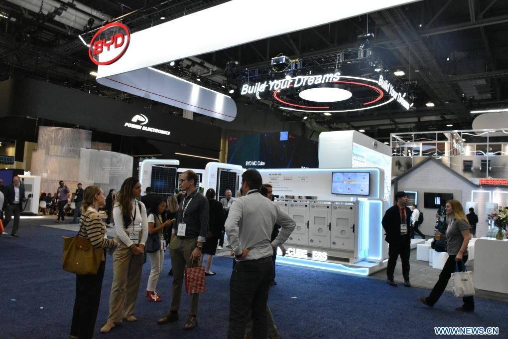 LAS VEGAS, 13 septiembre, 2023 (Xinhua) -- Imagen del 12 de septiembre de 2023 de personas visitando el área de exposición de la empresa china BYD durante la exposición RE+ 2023, en Las Vegas, Estados Unidos. Las empresas chinas acapararon la atención en la principal exposición de energía limpia de América del Norte llevada a cabo en Las Vegas esta semana, ampliando su influencia y oportunidades en el mercado global. (Xinhua/Zeng Hui)