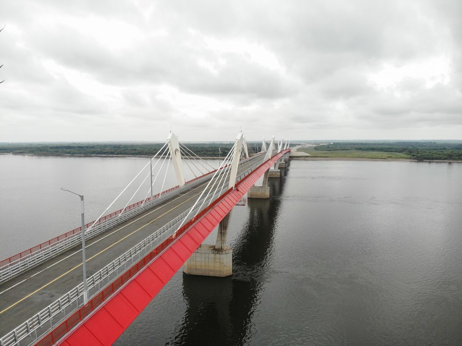 Vista aérea del 11 de agosto de 2023 del puente de la autopista transfronteriza Heihe-Blagoveshchensk, en la frontera entre China y Rusia. (Xinhua/Wang Song)