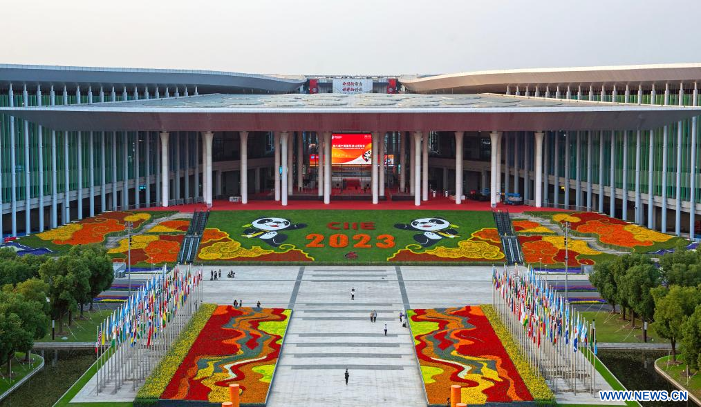SHANGHAI, 4 noviembre, 2023 (Xinhua) -- Imagen del 3 de noviembre de 2023 de la plaza sur del Centro Nacional de Exposiciones y Convenciones (Shanghai), la sede principal de la VI Exposición Internacional de Importaciones de China (CIIE, por sus siglas en inglés), en Shanghai, en el este de China. La VI CIIE está programada para celebrarse en Shanghai del 5 al 10 de noviembre. La exposición muestra el nuevo paradigma de desarrollo de China, una plataforma para la apertura de alto nivel y un bien público para todo el mundo. (Xinhua/Liu Ying)