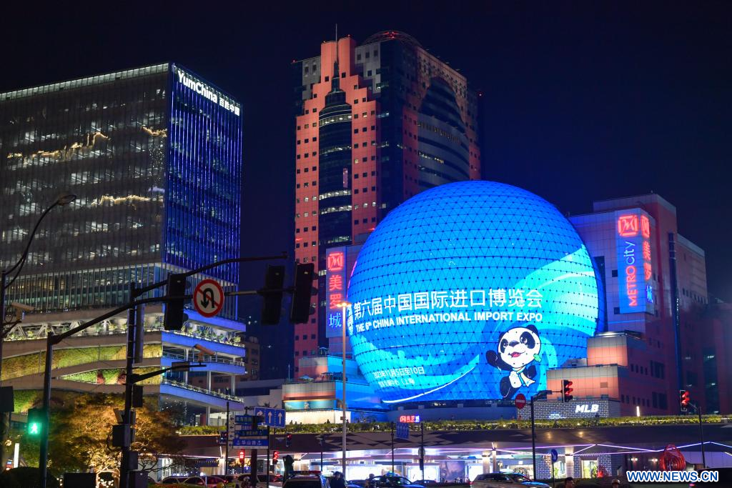 SHANGHAI, 4 noviembre, 2023 (Xinhua) -- Imagen del 3 de noviembre de 2023 de un cartel electrónico de la VI Exposición Internacional de Importaciones de China (CIIE, por sus siglas en inglés), en el distrito de Xuhui de Shanghai, en el este de China. La VI CIIE está programada para celebrarse en Shanghai del 5 al 10 de noviembre. La exposición muestra el nuevo paradigma de desarrollo de China, una plataforma para la apertura de alto nivel y un bien público para todo el mundo. (Xinhua/Meng Tao)