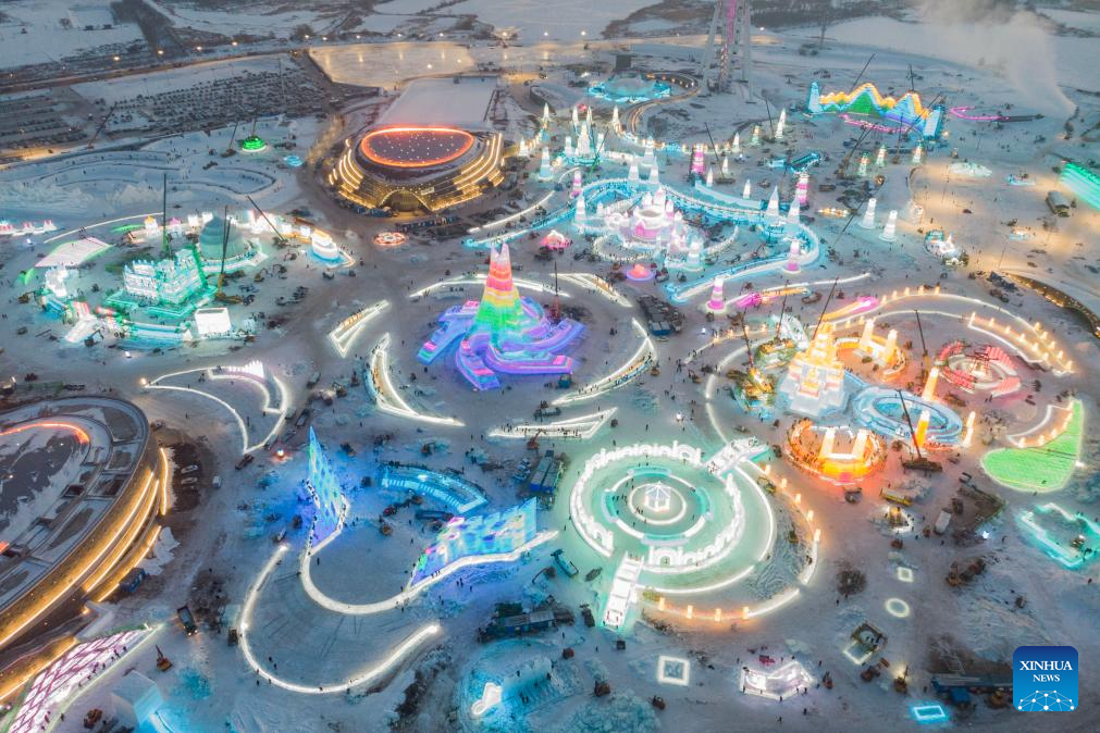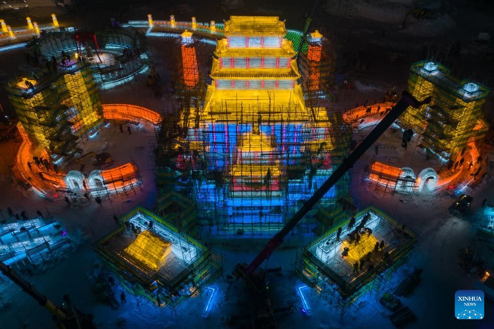 HARBIN, 14 diciembre, 2023 (Xinhua) -- Vista aérea del 12 de diciembre de 2023 del sitio de construcción del Mundo de Hielo y Nieve de Harbin, un renombrado parque temático estacional que abre cada invierno, en Harbin, en la provincia de Heilongjiang, en el noreste de China. El Mundo de Hielo y Nieve de Harbin abrirá para su 25 temporada invernal el 18 de diciembre. Se estima que 250.000 metros cúbico de hielo y nieve serán usados en su construcción. (Xinhua/Zhang Tao)