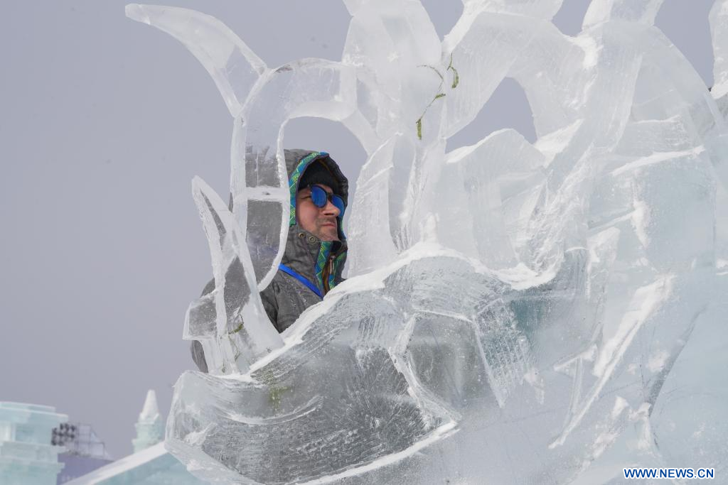 HARBIN, 2 enero, 2024 (Xinhua) -- Un competidor trabaja en una escultura de hielo durante el 35° Concurso Internacional de Esculturas de Hielo de Harbin en el Mundo de Hielo y Nieve de Harbin, en Harbin, en la provincia de Heilongjiang, en el noreste de China, el 2 de enero de 2024. La competencia de tres días de duración comenzó aquí el martes. (Xinhua/Wang Jianwei)