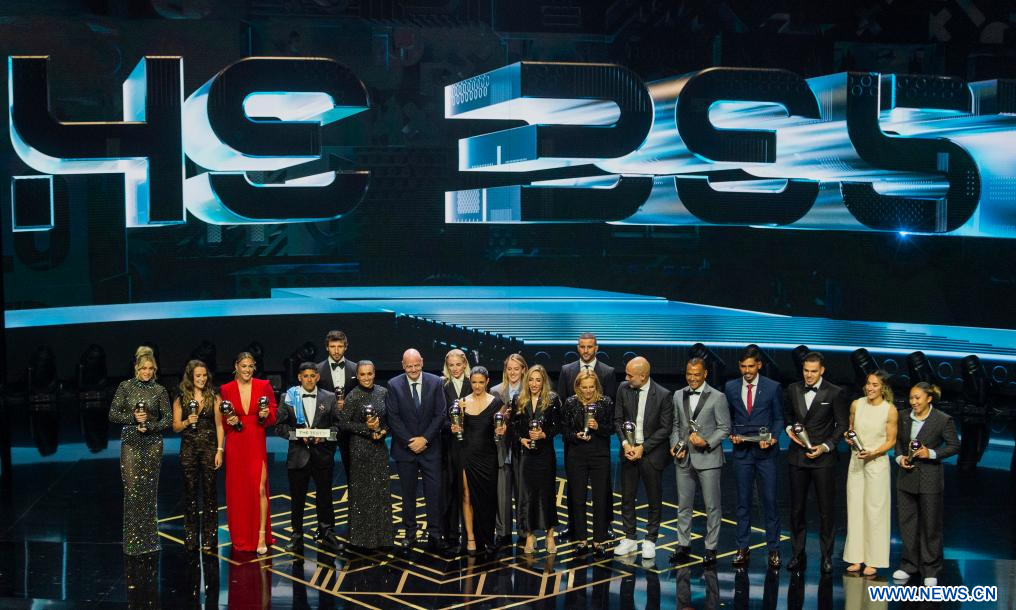 LONDRES, 16 enero, 2024 (Xinhua) -- Imagen del 15 de enero de 2024 de los ganadores reunidos en el escenario con el presidente de la FIFA, Gianni Infantino (7-i), durante la entrega de los premios "The Best" de la FIFA 2023, en Londres, Reino Unido. (Xinhua/Stephen Chung)
