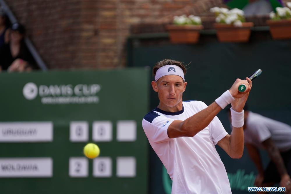 MONTEVIDEO, 3 febrero, 2024 (Xinhua) -- Franco Roncadelli, de Uruguay, devuelve la pelota a Ilya Snitari, de Moldavia, durante el partido individual correspondiente al Grupo Mundial II de la Copa Davis, celebrado en el Carrasco Lawn Tennis Club, en Montevideo, capital de Uruguay, el 3 de febrero de 2024. (Xinhua/Nicolás Celaya)