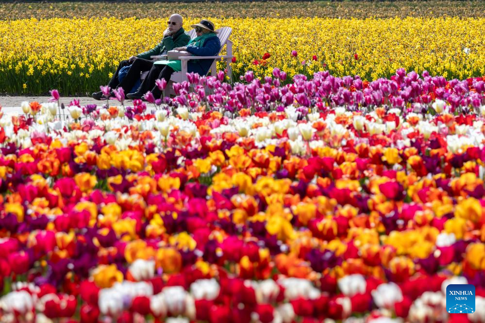LISSE, 15 abril, 2024 (Xinhua) -- Imagen del 14 de abril de 2024 de turistas disfrutando de tulipanes florecientes en el parque Keukenhof, en Lisse, Países Bajos. (Xinhua/Meng Dingbo)