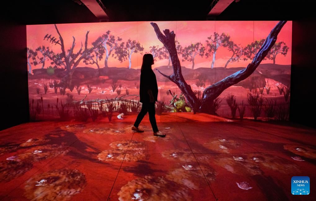 VANCOUVER, 31 mayo, 2024 (Xinhua) -- Imagen del 30 de mayo de 2024 de un visitante caminando frente a una proyección interactiva en tercera dimensión de un ambiente forestal durante una vista previa para los medios de comunicación de la exposición "La Tierra Importa: Repensando el Futuro" en el Mundo de la Ciencia, en Vancouver, Columbia Británica, Canadá. "La Tierra Importa: Repensando el Futuro" es la exposición más reciente en el Mundo de la Ciencia, en Vancouver, donde los visitantes pueden explorar los cambios del planeta a través de exhibiciones inmersivas e interactivas sobre la biodiversidad, el cambio climático y la sostenibilidad. (Xinhua/Liang Sen)