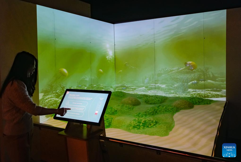 VANCOUVER, 31 mayo, 2024 (Xinhua) -- Imagen del 30 de mayo de 2024 de un mapa de proyección interactiva en tercera dimensión de un arrecife de coral mostrando los cambios en su ecosistema durante una vista previa para los medios de comunicación de la exposición "La Tierra Importa: Repensando el Futuro" en el Mundo de la Ciencia, en Vancouver, Columbia Británica, Canadá. "La Tierra Importa: Repensando el Futuro" es la exposición más reciente en el Mundo de la Ciencia, en Vancouver, donde los visitantes pueden explorar los cambios del planeta a través de exhibiciones inmersivas e interactivas sobre la biodiversidad, el cambio climático y la sostenibilidad. (Xinhua/Liang Sen)