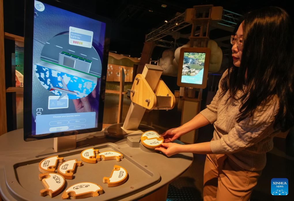 VANCOUVER, 31 mayo, 2024 (Xinhua) -- Imagen del 30 de mayo de 2024 de una exhibición interactiva mostrando las cantidades de emisiones de carbono usadas por diferentes transportes durante una vista previa para los medios de comunicación de la exposición "La Tierra Importa: Repensando el Futuro" en el Mundo de la Ciencia, en Vancouver, Columbia Británica, Canadá. "La Tierra Importa: Repensando el Futuro" es la exposición más reciente en el Mundo de la Ciencia, en Vancouver, donde los visitantes pueden explorar los cambios del planeta a través de exhibiciones inmersivas e interactivas sobre la biodiversidad, el cambio climático y la sostenibilidad. (Xinhua/Liang Sen)