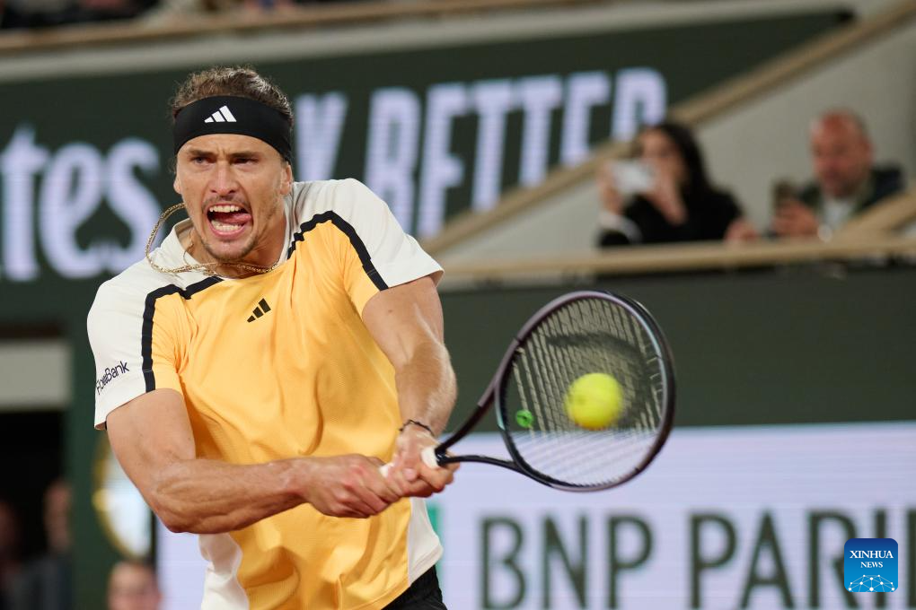 PARIS, 6 junio, 2024 (Xinhua) -- Imagen del 5 de junio de 2024 de Alexander Zverev devolviendo la pelota durante el partido de cuartos de final de individuales masculinos entre Alexander Zverev, de Alemania, y Alex de Minaur, de Australia, en el torneo de tenis Abierto de Francia en Roland Garros, en París, Francia. (Xinhua/Meng Dingbo)