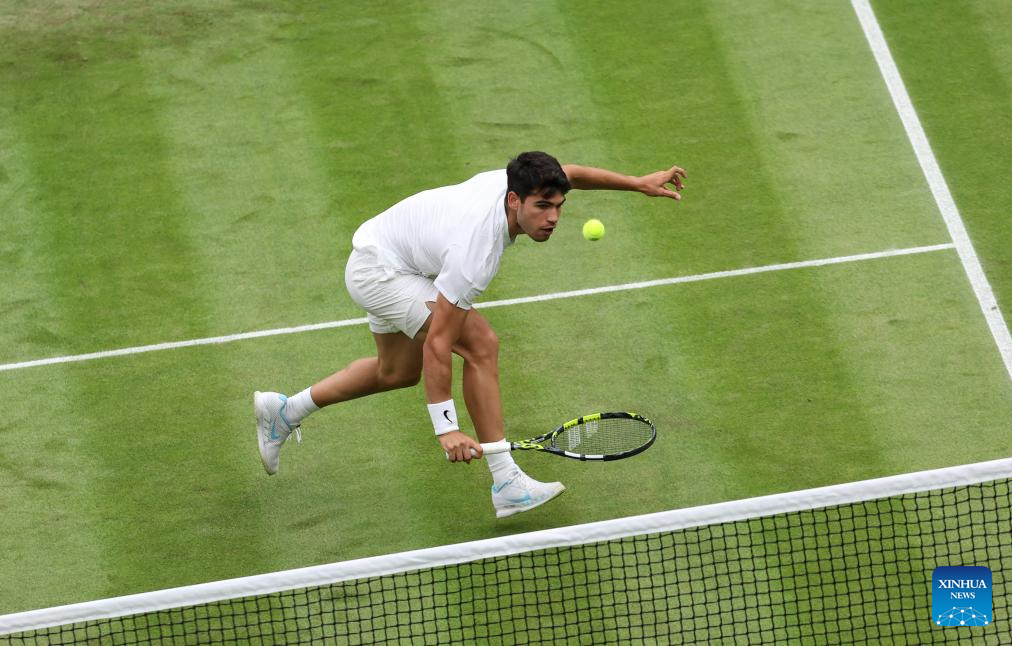 LONDRES, 4 julio, 2024 (Xinhua) -- Imagen del 3 de julio de 2024 de Carlos Alcaraz, de España, devolviendo la pelota durante el partido de segunda ronda de individuales masculinos entre Aleksandar Vukic, de Australia, y Carlos Alcaraz, de España, en el Campeonato de Tenis de Wimbledon, en Londres, Reino Unido. (Xinhua/Han Yan)