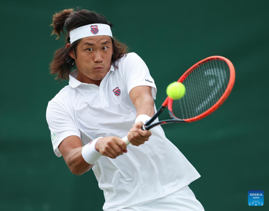 LONDRES, 4 julio, 2024 (Xinhua) -- Imagen del 3 de julio de 2024 de Zhang Zhizhen, de China, devolviendo la pelota durante el partido de segunda ronda de individuales masculinos entre Zhang Zhizhen, de China, y Jan-Lennard Struff, de Alemania, en el Campeonato de Tenis de Wimbledon, en Londres, Reino Unido. (Xinhua/Han Yan)