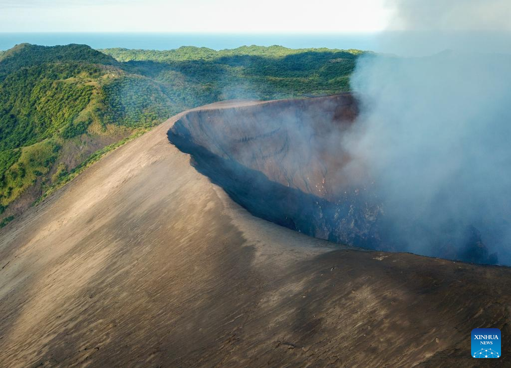 TANNA, 4 julio, 2024 (Xinhua) -- Vista aérea tomada con un dron el 2 de julio de 2024 del cráter del monte Yasur, en Tanna, Vanuatu. (Xinhua/Guo Lei)