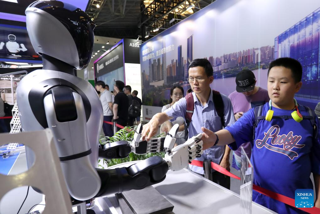 SHANGHAI, 5 julio, 2024 (Xinhua) -- Visitantes tocan las manos biónicas de un robot durante la Conferencia Mundial de IA de 2024, en Shanghai, en el este de China, el 5 de julio de 2024. Robots impulsados por IA que muestran diversas habilidades han cautivado a muchos visitantes durante la Conferencia Mundial de IA de 2024. (Xinhua/Fang Zhe)