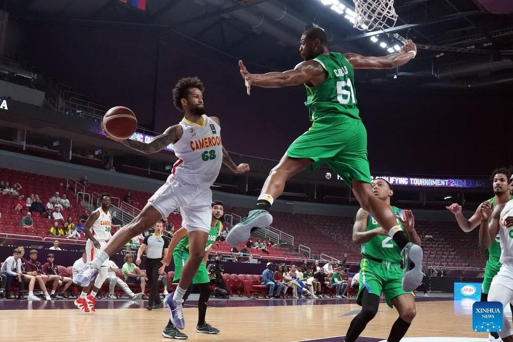 RIGA, 5 julio, 2024 (Xinhua) -- Imagen del 4 de julio de 2024 de Paul Eboua, de Camerún, intentando realizar una anotación durante el partido correspondiente al Grupo B del Torneo Masculino de Clasificación Olímpica FIBA 2024, entre Camerún y Brasil, en Riga, Letonia. (Xinhua/Edijs Palens)