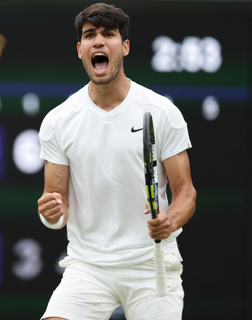 LONDRES, 8 julio, 2024 (Xinhua) -- Imagen del 7 de julio de 2024 de Carlos Alcaraz festejando un punto durante el partido de la cuarta ronda de individuales masculinos entre Ugo Humbert, de Francia, y Carlos Alcaraz, de España, en el Campeonato de Tenis de Wimbledon, en Londres, Reino Unido. (Xinhua/Han Yan)