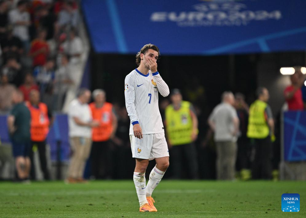 MUNICH, 10 julio, 2024 (Xinhua) -- Imagen del 9 de julio de 2024 de Antoine Griezmann, de Francia, reaccionando al término del partido correspondiente a la semifinal de la EURO 2024 de la UEFA, entre España y Francia, en Múnich, Alemania. (Xinhua/Bai Xuefei)