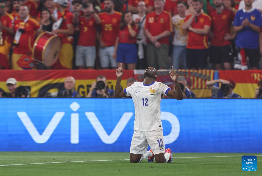 MUNICH, 10 julio, 2024 (Xinhua) -- Imagen del 9 de julio de 2024 de Randal Kolo Muani, de Francia, festejando una anotación durante el partido correspondiente a la semifinal de la EURO 2024 de la UEFA, entre España y Francia, en Múnich, Alemania. (Xinhua/Bai Xuefei)