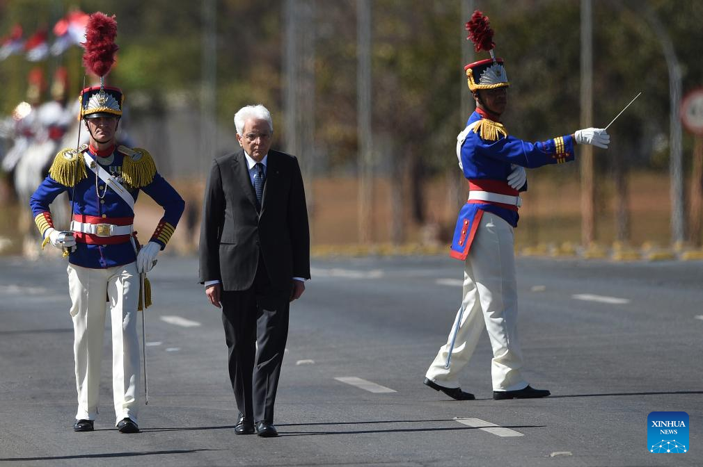 El presidente italiano, Sergio Mattarella (c), pasa revista a la guardia de honor durante la ceremonia de bienvenida, en el Palacio de Planalto, en Brasilia, Brasil, el 15 de julio de 2024. Los presidentes de Brasil, Luiz Inácio Lula da Silva, y de Italia, Sergio Mattarella, coincidieron el lunes en su interés por concluir el acuerdo comercial entre el Mercado Común del Sur y la Unión Europea. (Xinhua/Lucio Tavora)
