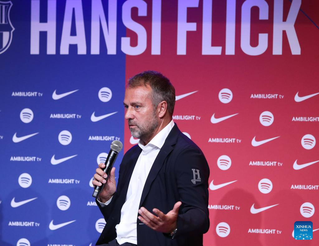 BARCELONA, 26 julio, 2024 (Xinhua) -- Imagen del 25 de julio de 2024 del nuevo director técnico de FC Barcelona, Hansi Flick, hablando durante su evento oficial de presentación, en Barcelona, España. (Xinhua/Joan Gosa)