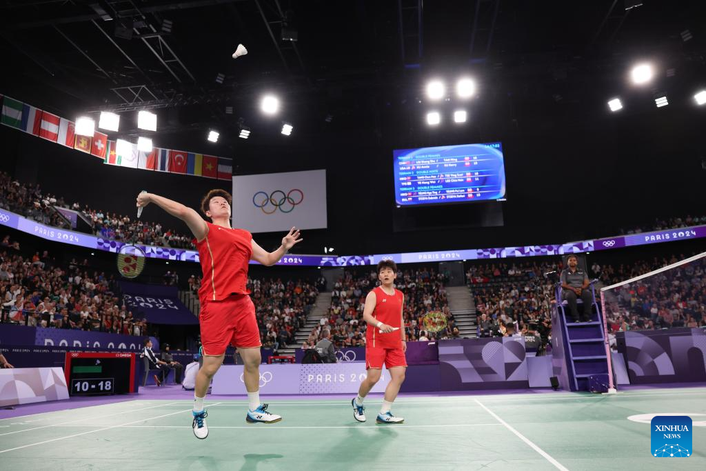 PARIS, 27 julio, 2024 (Xinhua) -- Liu Shengshu (i)/Tan Ning de China compiten durante el partido de bádminton de la fase de grupos de dobles femeninos ante Annie Xu/Kerry Xu de los Estados Unidos en los Juegos Olímpicos de París 2024, en París, Francia, el 27 de julio de 2024. (Xinhua/Chen Bin)