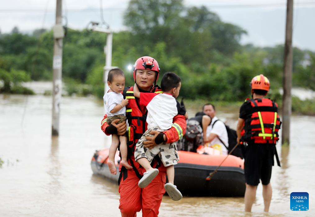 CHANGSHA, 28 julio, 2024 (Xinhua) -- Rescatistas reubican a residentes, en la aldea de Jingtang de la ciudad de Zixing, en la provincia de Hunan, en el centro de China, el 28 de julio de 2024. Los vientos residuales del tifón Gaemi continúan provocando fuertes lluvias en muchos lugares de la provincia de Hunan y las autoridades locales están llevando a cabo activamente trabajos de rescate y socorro. (Xinhua/Li Ke)