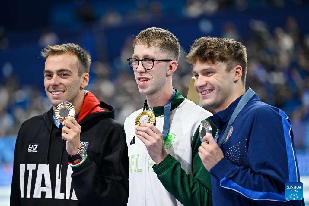 PARIS, 30 julio, 2024 (Xinhua) -- El medallista de oro Daniel Wiffen (c) de Irlanda, el medallista de plata Bobby Finke (d) de Estados Unidos y el medallista de bronce Gregorio Paltrinieri de Italia posan para fotografías al término de la ceremonia de victoria para 800 m estilo libre masculino de natación en los Juegos Olímpicos de París 2024, en París, Francia, el 30 de julio 2024. (Xinhua/Wang Peng)