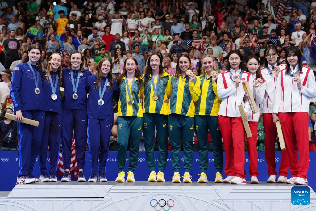 PARIS, 1 agosto, 2024 (Xinhua) -- Medallistas asisten a la ceremonia de victoria de relevo 4x200m estilo libre femenino de natación en los Juegos Olímpicos de París 2024, en París, Francia, el 1 de agosto de 2024. (Xinhua/Du Yu)
