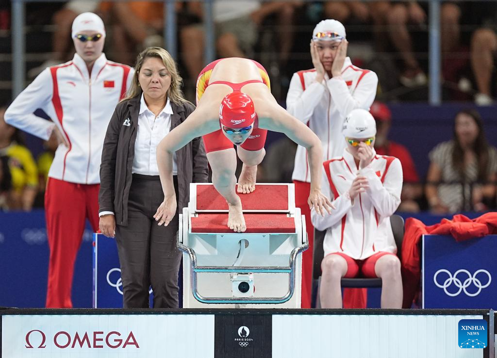 PARIS, 1 agosto, 2024 (Xinhua) -- Yang Junxuan de China se sumerge en la piscina durante la final de relevo 4x200m estilo libre femenino de natación en los Juegos Olímpicos de París 2024, en París, Francia, el 1 de agosto de 2024. (Xinhua/Du Yu)