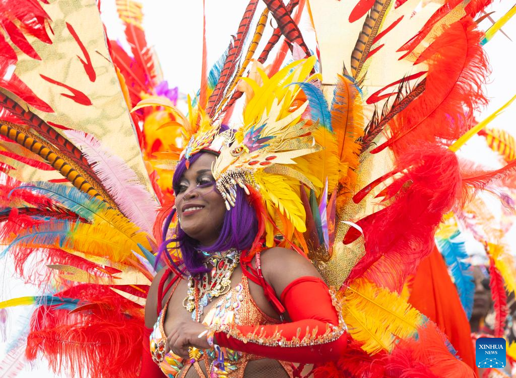 TORONTO, 4 agosto, 2024 (Xinhua) -- Imagen del 3 de agosto de 2024 de una juerguista participando en el Gran Desfile del Carnaval Caribeño de Toronto 2024, en Toronto, Canadá. El evento anual se celebró aquí el sábado para mostrar la cultura caribeña. (Xinhua/Zou Zheng)