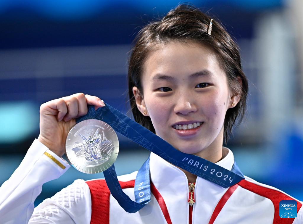 La medallista de plata Chen Yuxi de China asiste a la ceremonia de premiación al término de la final de plataforma 10m femenino de saltos en los Juegos Olímpicos de París 2024, en Saint Denis, Francia, el 6 de agosto de 2024. (Xinhua/Wang Peng)